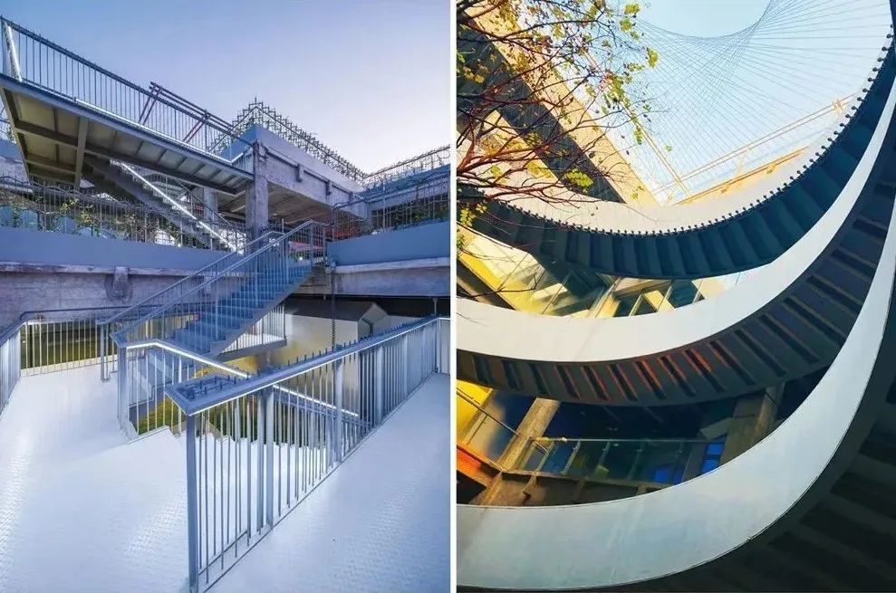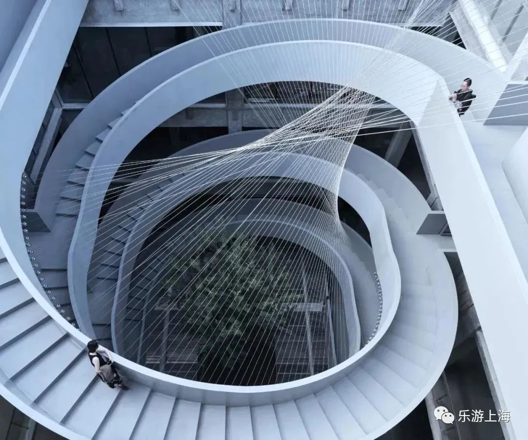 杨浦大桥下,滨江步道旁,工业风的钢铁森林,内部大有乾坤。建筑的中央建有螺旋式扶梯,连通着各层的展厅,直达楼顶花园。回旋楼梯搭配天台花园,是不得不看的建筑空间之一。