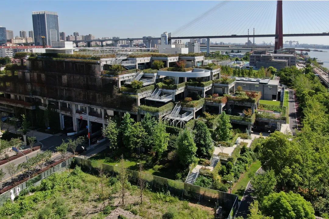 位于杨浦滨江南段的绿之丘,原为烟草公司机修仓库,前身是建于1920年的怡和冷库。改造过程中对烟草仓库做了体量削减,跨越道路,将步行、车行立交通过屋顶垂直绿化等技术措施,形成退台错叠的“空中花园”,使得建筑本身成为滨水景观的一部分。建筑改造后实现了工业建筑向绿色生态建筑的转变,满目苍翠,远望形似绿色的山丘,荣获“上海市既有建筑绿色更新改造评定”金奖。