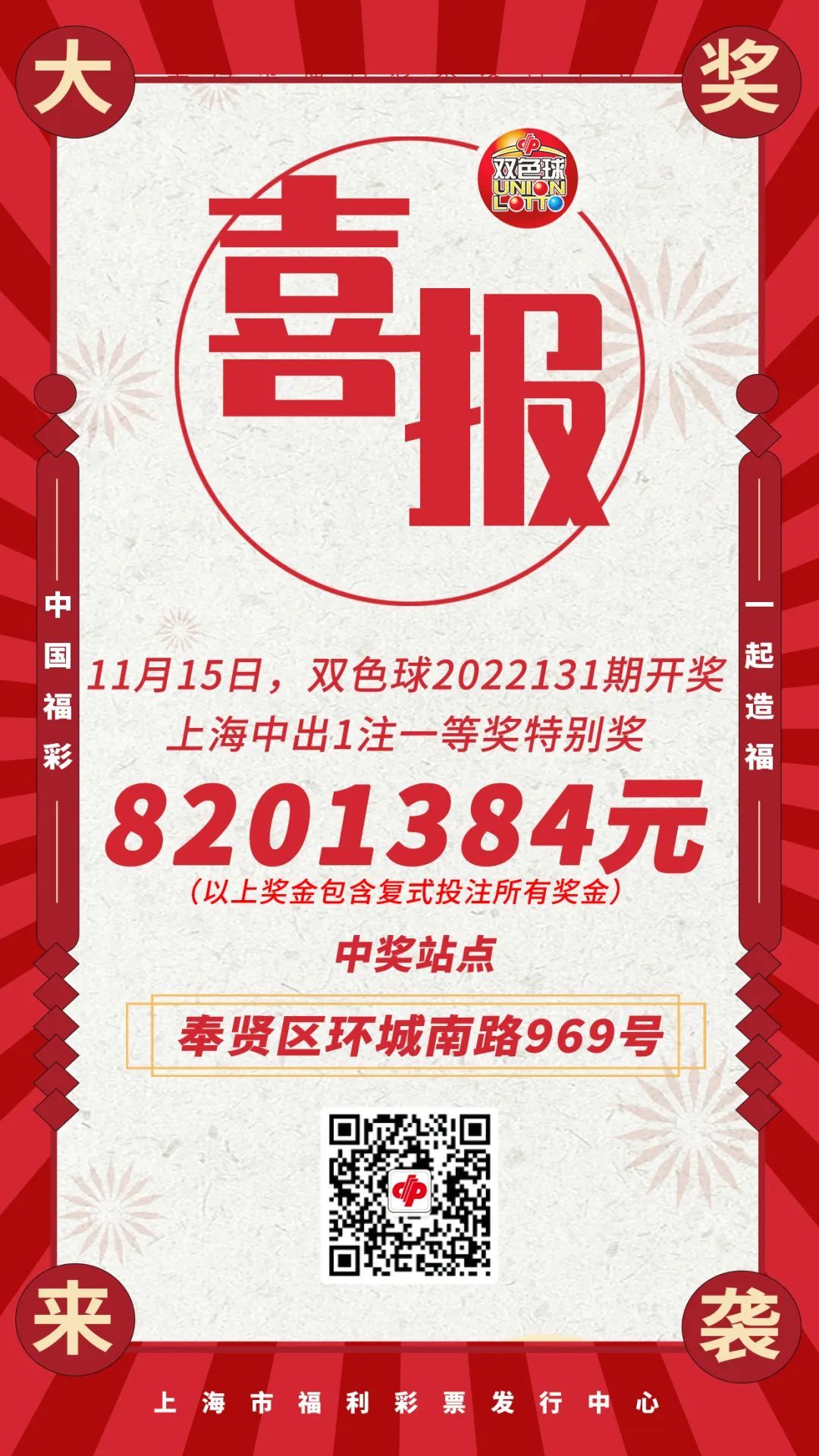 上海中得1注一等奖和1注一等奖特别奖,中奖彩票售出于奉贤区环城南路969号,为28元复式投注票,总奖金8201384元。这也是双色球12亿元大派奖活动启动以来,上海首次揽获一等奖特别奖。