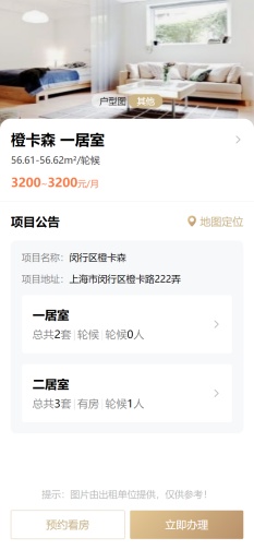 3、查看房源信息后,可选择“预约看房”或“立即办理”。