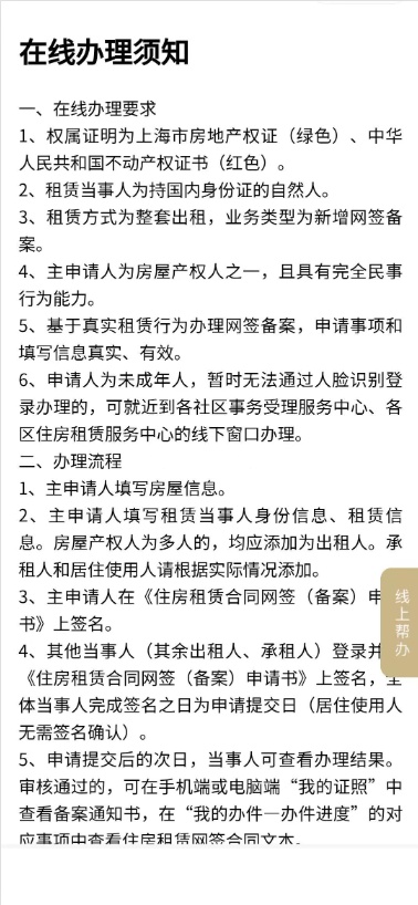 租房成交后,可以在线办理住房租赁网签备案,阅读在线办理须知后按照页面流程进行办理。注意需要由房东发起,房东和租客都要签名确认。