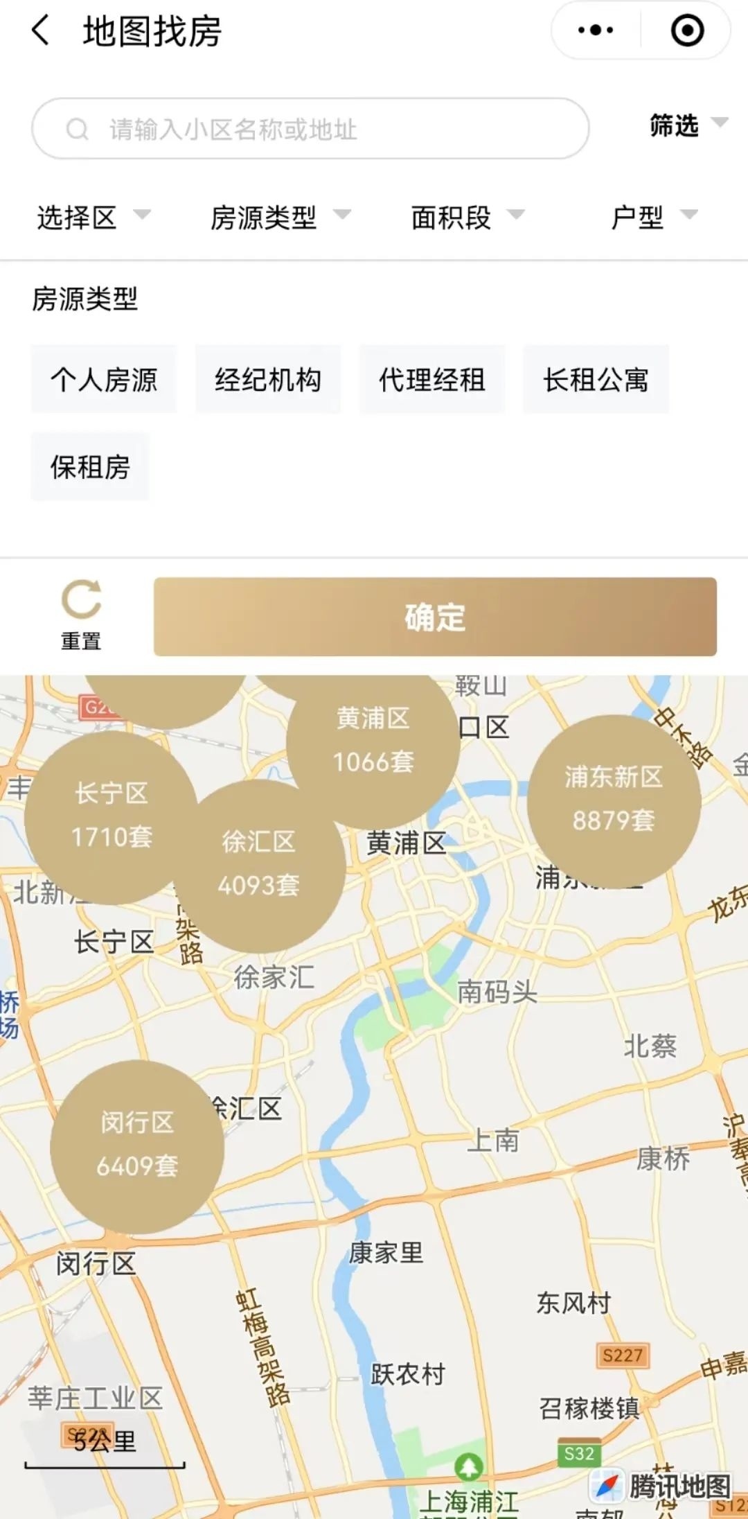 2、支持行政区、街镇、小区的地图筛选,可通过点击圆圈或放大缩小屏幕进行操作,查看相应范围内的房源数量与信息。