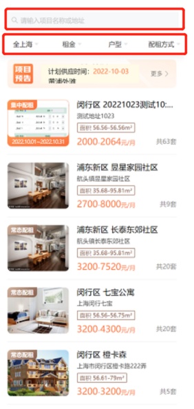 2、点击“我要找房”,通过上方搜索栏搜索目标房源,或结合自身需要筛选区域、租金范围、户型及配租方式,即可查找对应的房源信息。