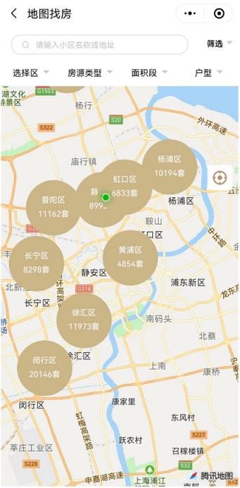 1、打开“随申办”微信小程序、“随申办”APP或支付宝小程序,首页搜索进入“我要租房”,选择“地图找房”,进入服务页面后,系统会自动定位当前所在位置,并以当前位置为中心展示上海市各区出租房源数量。