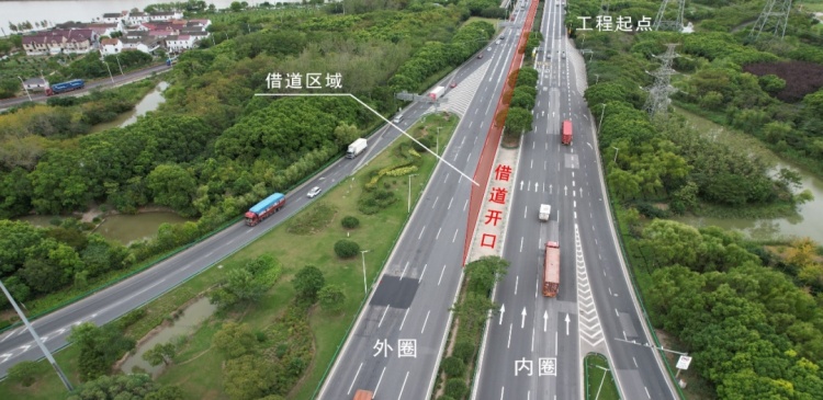 施工前在路段两端中央隔离带处增设借道口,借用外圈1号车道通行(借道长度4.6公里)。第一阶段施工占用S20外环高速内圈3号、4号车道;第二阶段施工占用S20外环高速内圈1号、2号车道。施工期间维持双向6车道(三来三去)通行。