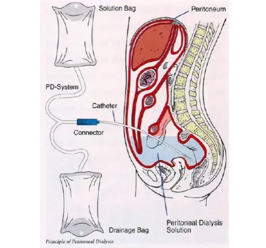 腹膜透析(PD)是利用腹膜作为半渗透膜的特性,通过重力作用将配制好的透析液规律、定时经导管灌入患者的腹膜腔,由于在腹膜两侧存在溶质的浓度梯度差,高浓度一侧的溶质向低浓度一侧移动(弥散作用);水分则从低渗一侧向高渗一侧移动(渗透作用)。通过腹腔透析液不断地更换,以达到清除体内代谢产物、毒性物质及纠正水、电解质平衡紊乱的目的。