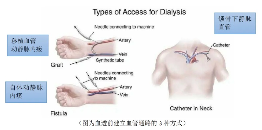 使用自体/移植血管动静脉瘘进行血透时,护士会将两个针头刺入血管,而使用中心静脉导管血透时,需将导管与机器上的导管连接。