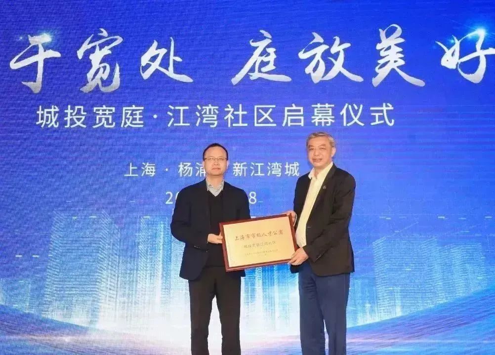 张立新向“城投宽庭·江湾社区”授予“上海市市级人才公寓项目”的铜牌。
