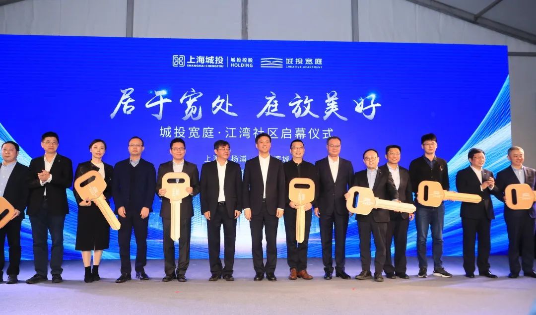 谢坚钢、王桢、尼冰、张立新、蒋曙杰、何刚强、徐雷共同为“城投宽庭·江湾社区”启幕,并向复旦大学、SMG、上汽大通、国泰君安、夺畅网络、新思科技、西部证券等单位代表交付住房钥匙。