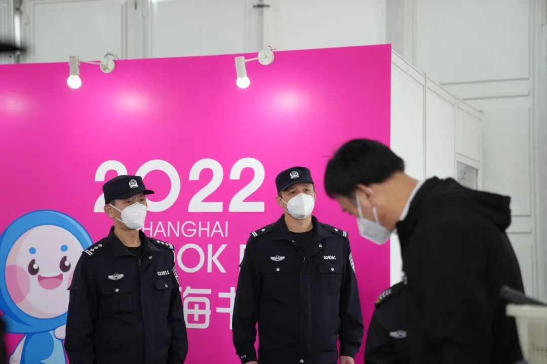 上午,在延安中路的上海展览中心书展入口通道,预约了书展的市民在工作人员的引导下,经过验证核酸报告、健康申报、安检以及刷身份证等流程,走进书展主会场。在入口处、广场上,都可以看到民警一线保障的身影。