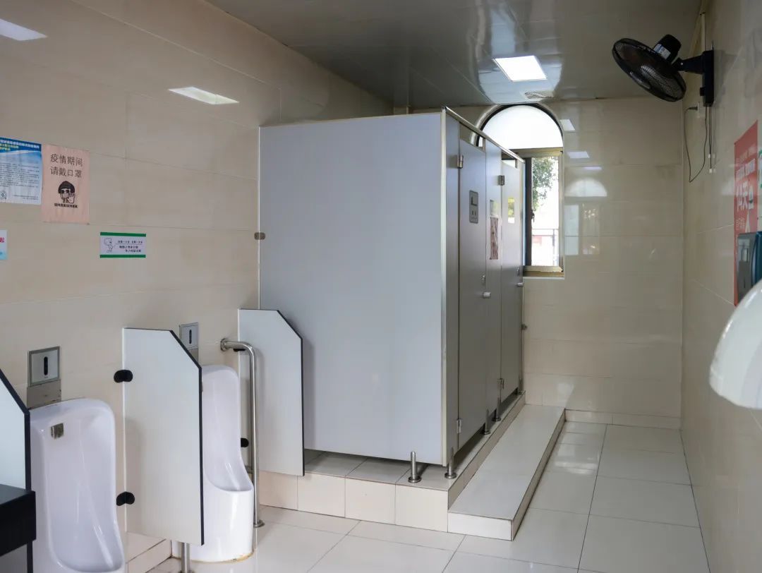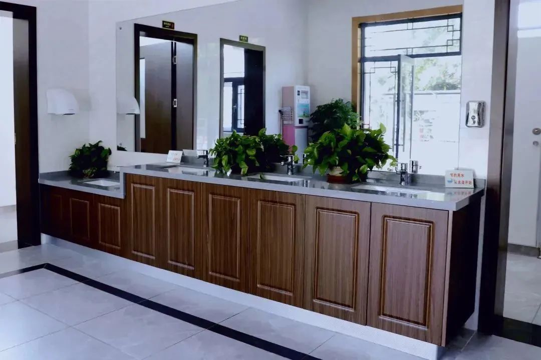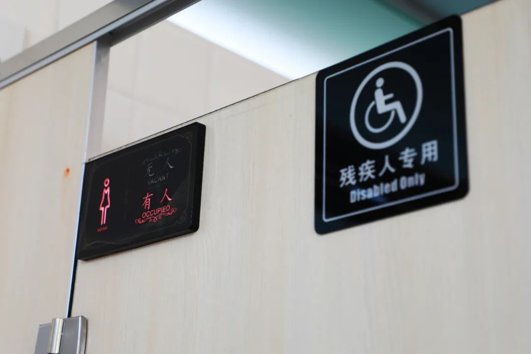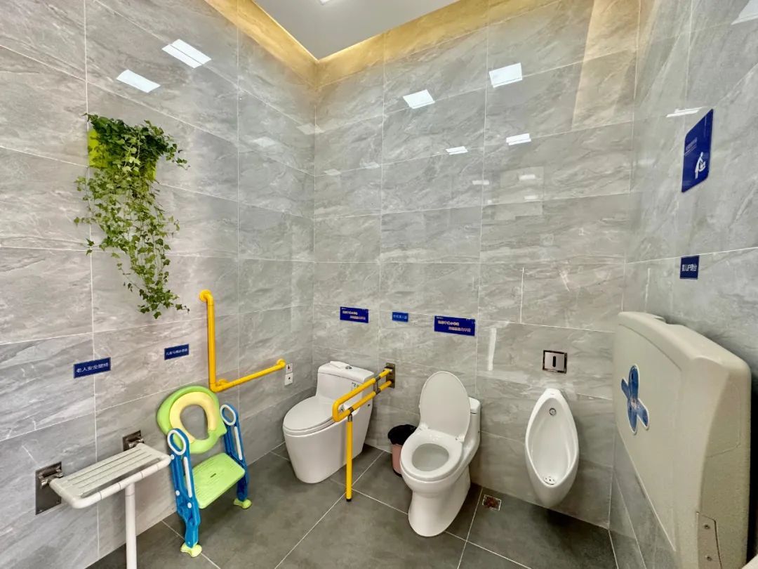 厕所总占地面积约53平方米,设置男厕、女厕以及家庭卫生间。其中,家庭卫生间配备有无障碍设施、儿童马桶、婴儿护理台等,方便老人、孩子以及残障人士使用。