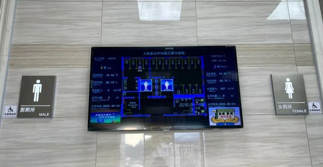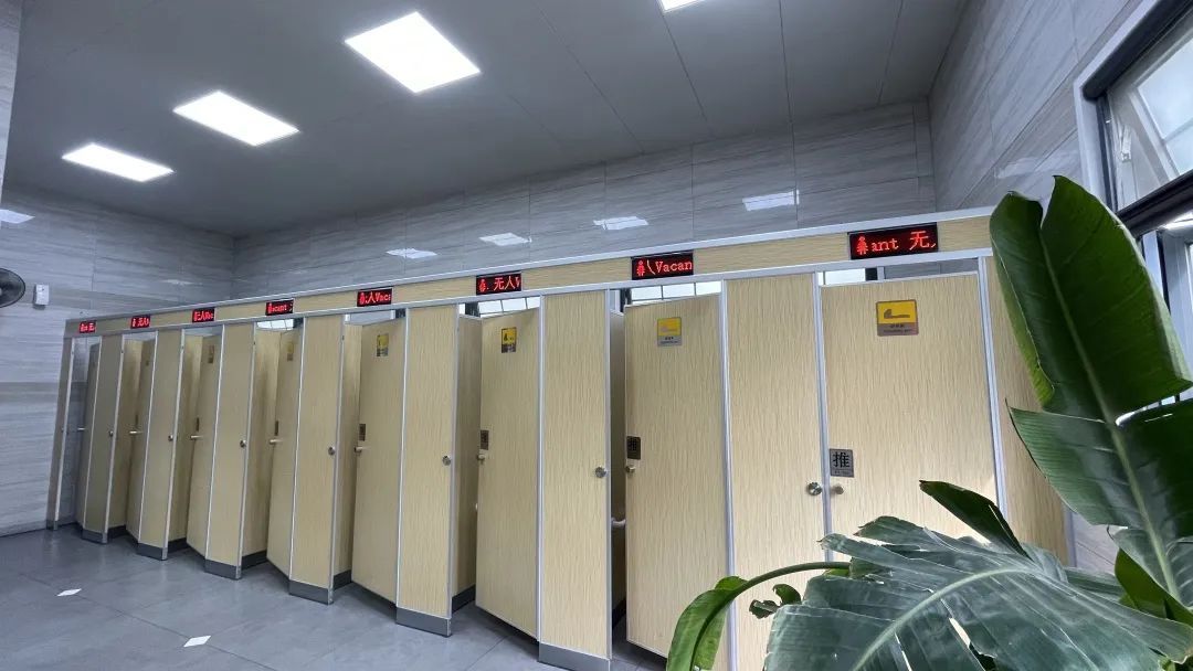 公厕入口处的显示屏显示温度、湿度、氨气、硫化氢、PM2.5等指标,实时监测空气质量。每个厕位都装有传感器,直观显示“有人”或“无人”。