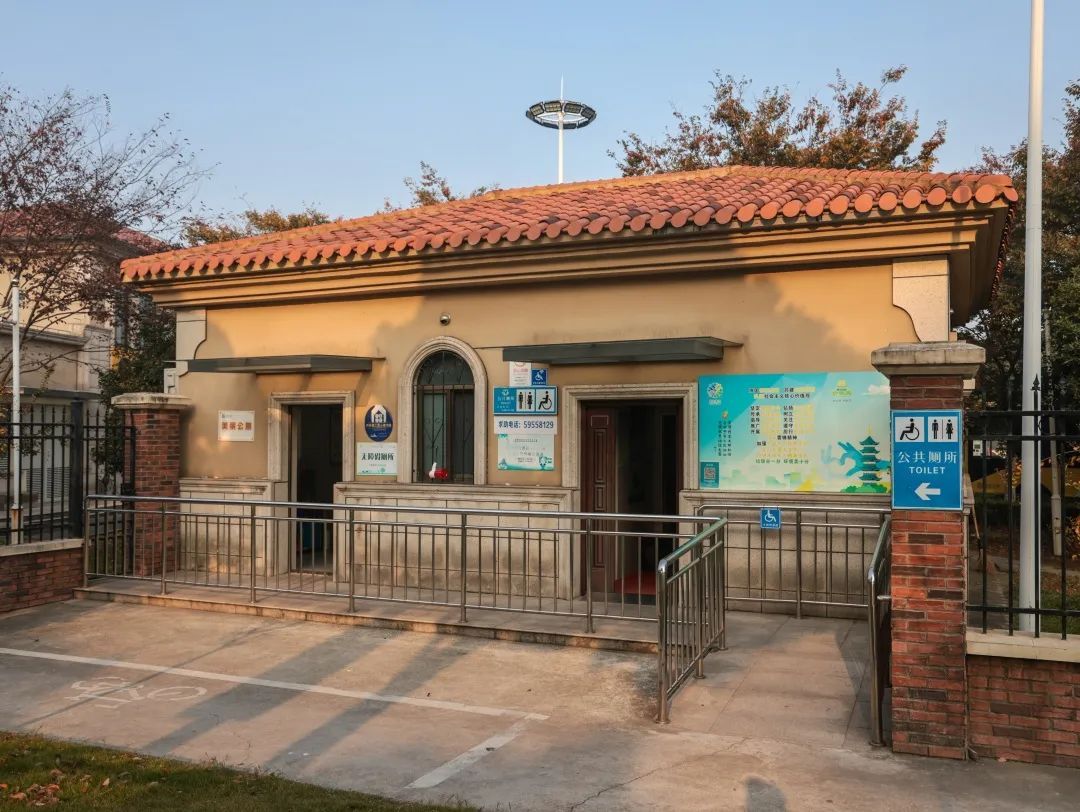 在徐行镇启秀路公交站点旁,有一座红顶黄墙、可爱别致的欧式风格公厕。