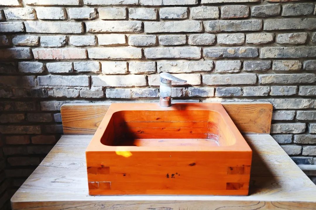 内部古雅的盥洗台、木艺镂空吊灯等细节装饰与外观相得益彰。门前设置木质休闲座椅,给人舒适、悠然之感。
