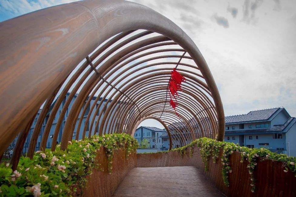 弯篓桥和鱼篓桥,仿照农家竹编鱼篓,设计了弧形的上盖,枝条横蔓,野趣盎然,却又充满现代感。