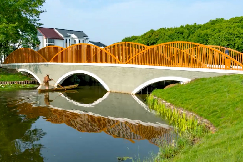 沈家桥就简单得多,笔直桥身,桥洞下可以穿行小船。但桔黄色竖条栏杆,色彩夺目,让人恍若走进了艺术展览空间。