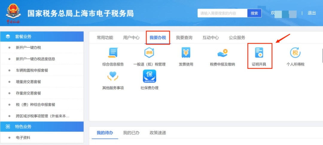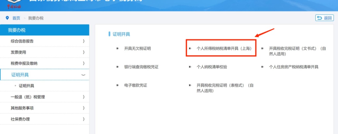 第一步:登录成功后,选择【我要办税】——【证明开具】——【个人所得税纳税清单开具(上海)】。