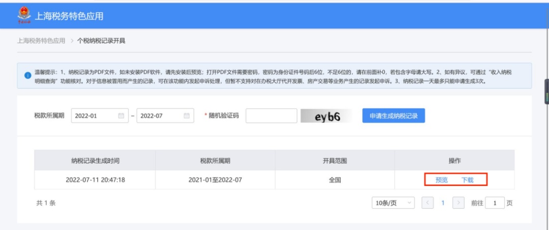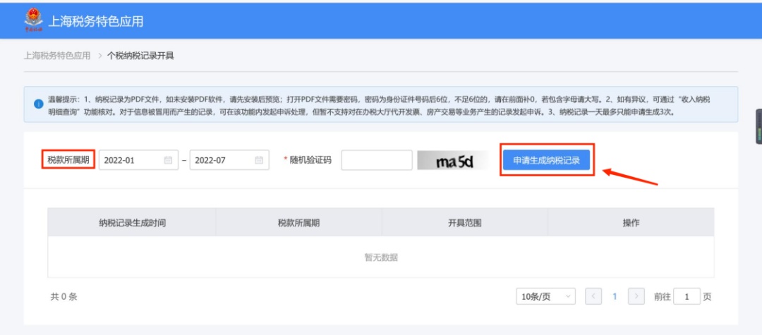第二步:进入个税纳税记录开具页面后,根据实际需要,调整“税款所属期”起止时间,输入随机验证码,点击【申请生成纳税记录】。