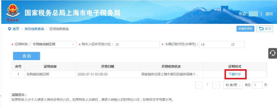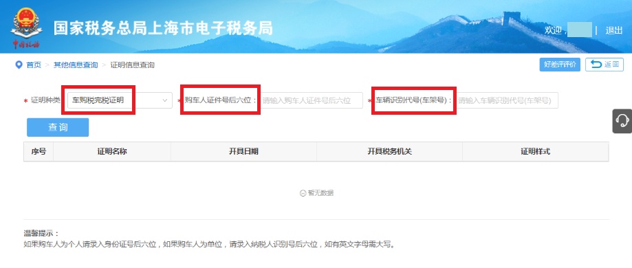 第一步:纳税人进入证明信息查询后,证明种类中下拉框选择“车购税完税证明”,输入购车人证件号后六位及查询车辆的车辆识别代号,点击“查询”。
