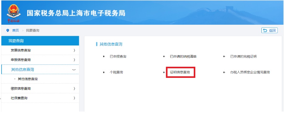 登录电子税务局后,选择【我要查询】——【其他信息查询】——【证明信息查询】。