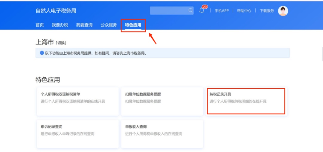 第一步:登录成功后,选择【特色应用】——【纳税记录查询】。