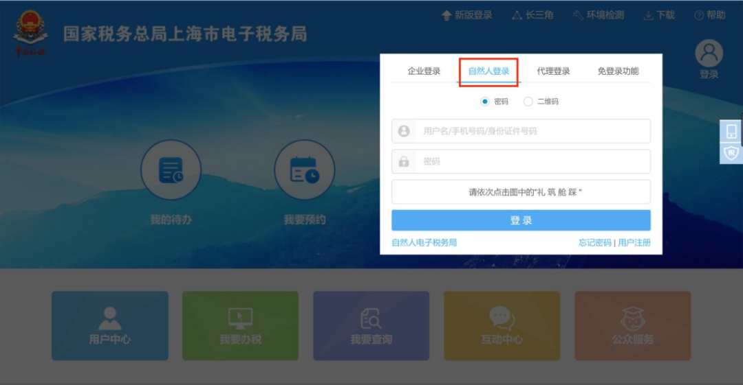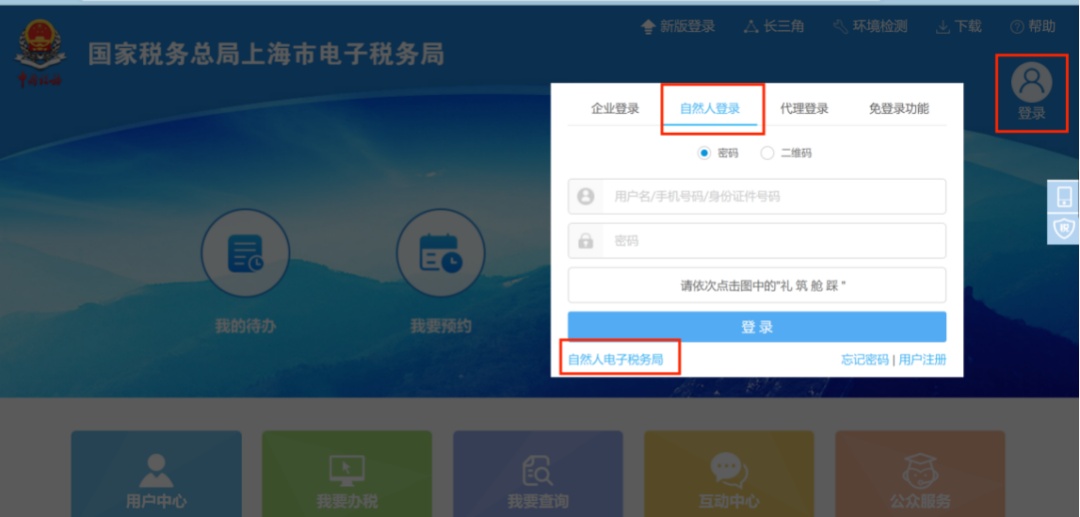 通过上海市电子税务局“登录”界面,点击选择【自然人登录】——【自然人电子税务局】,登入自然人电子税务局。