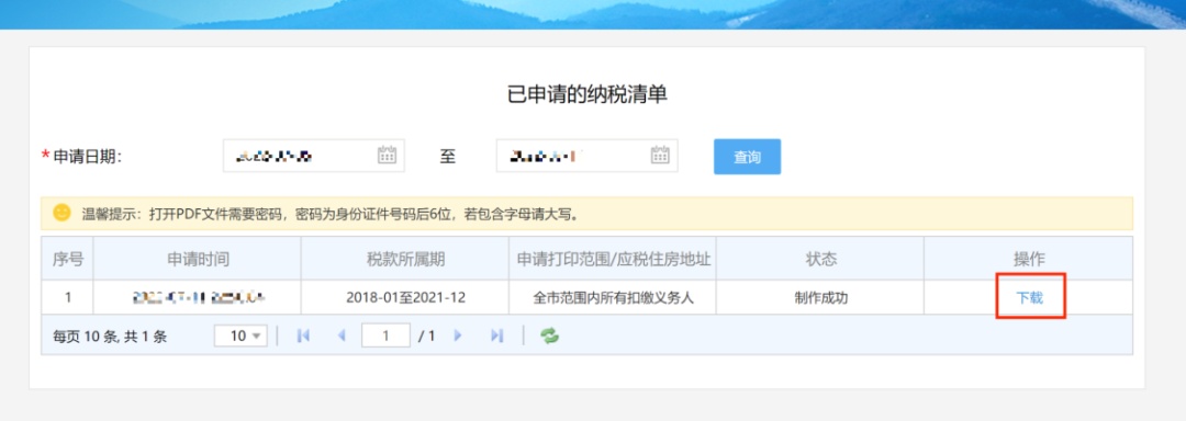 第三步:点击“纳税清单下载申请”,可下载PDF文件格式的纳税清单。