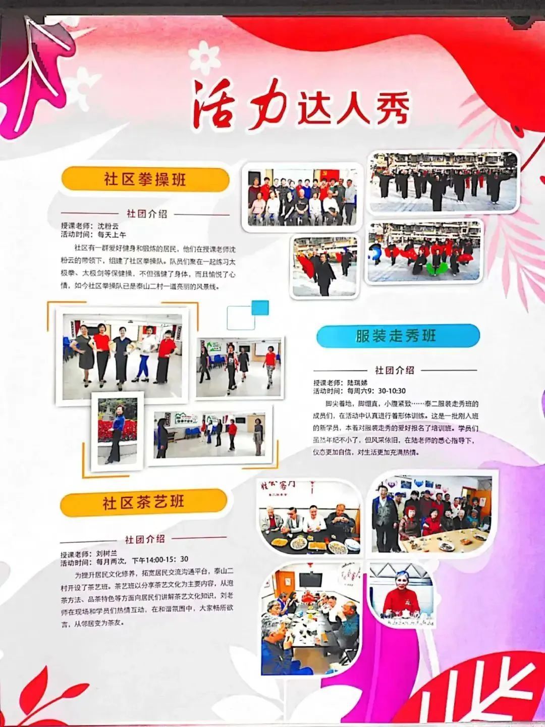 不仅如此,泰山二村还依托“社区云”平台,宣传拳操、乒乓、时尚走秀、党员学习小组、书画、茶艺等一系列文体活动,吸引小区居民广泛参与,提升全小区不同年龄段、不同兴趣面的居民对社区建设的关注度、参与度。