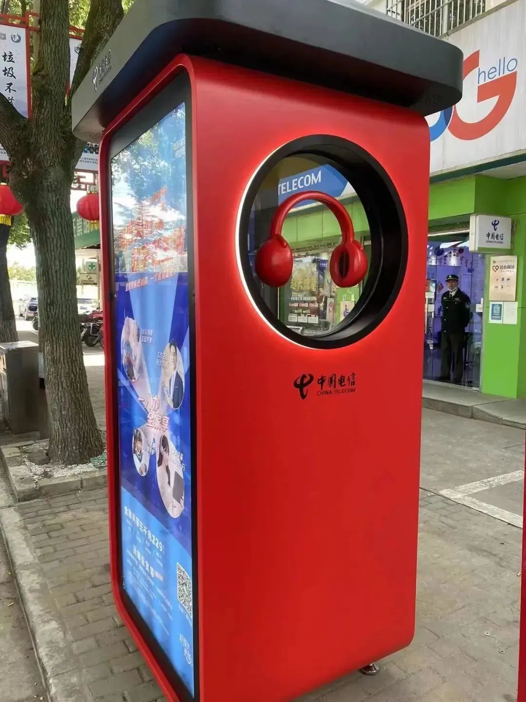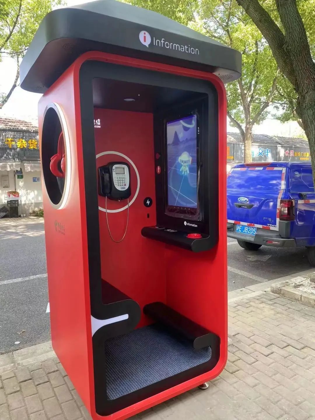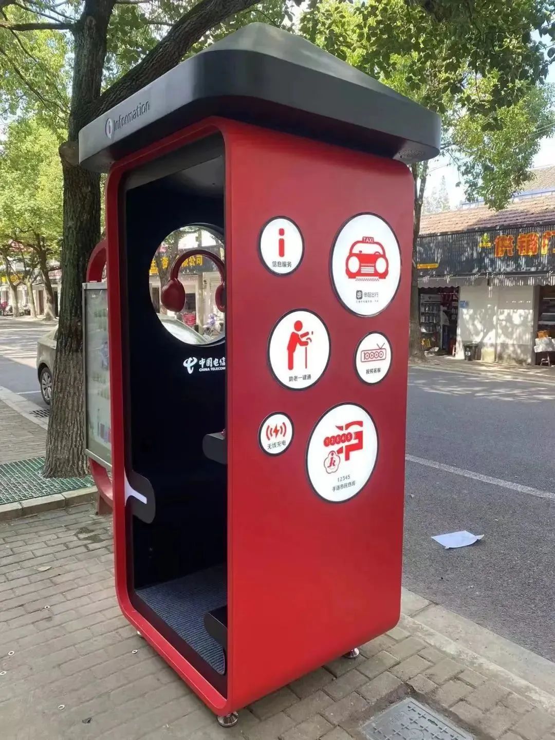 “数字公话亭”整体采用红色,造型鲜亮、时尚、摩登。亭内的设施设备布局合理温馨,智能服务功能布局大气、显示清晰。