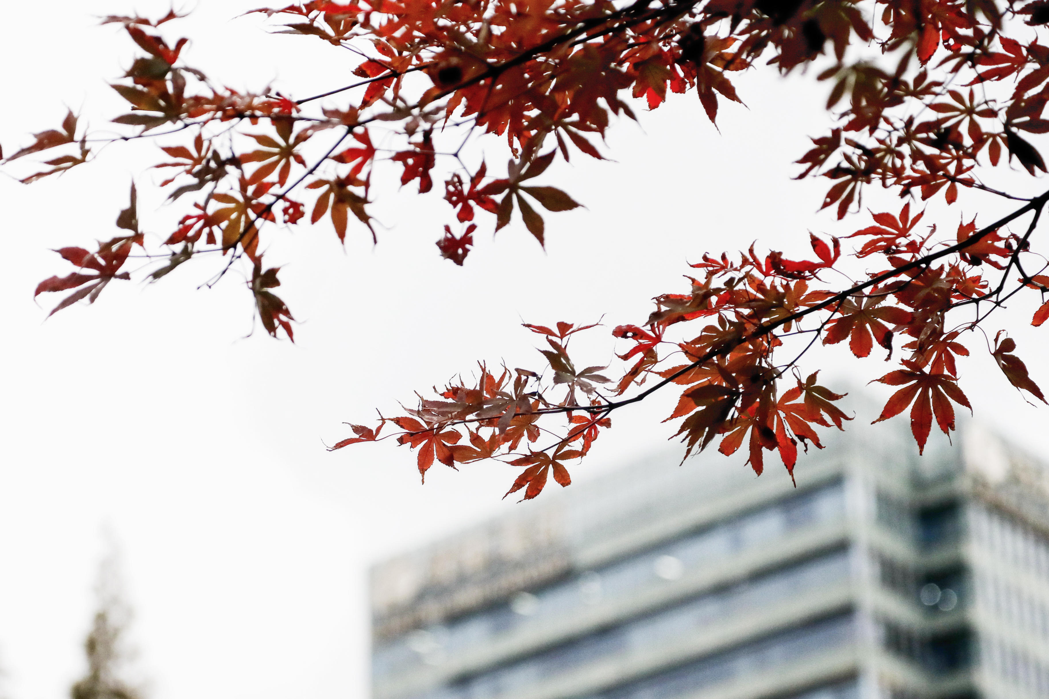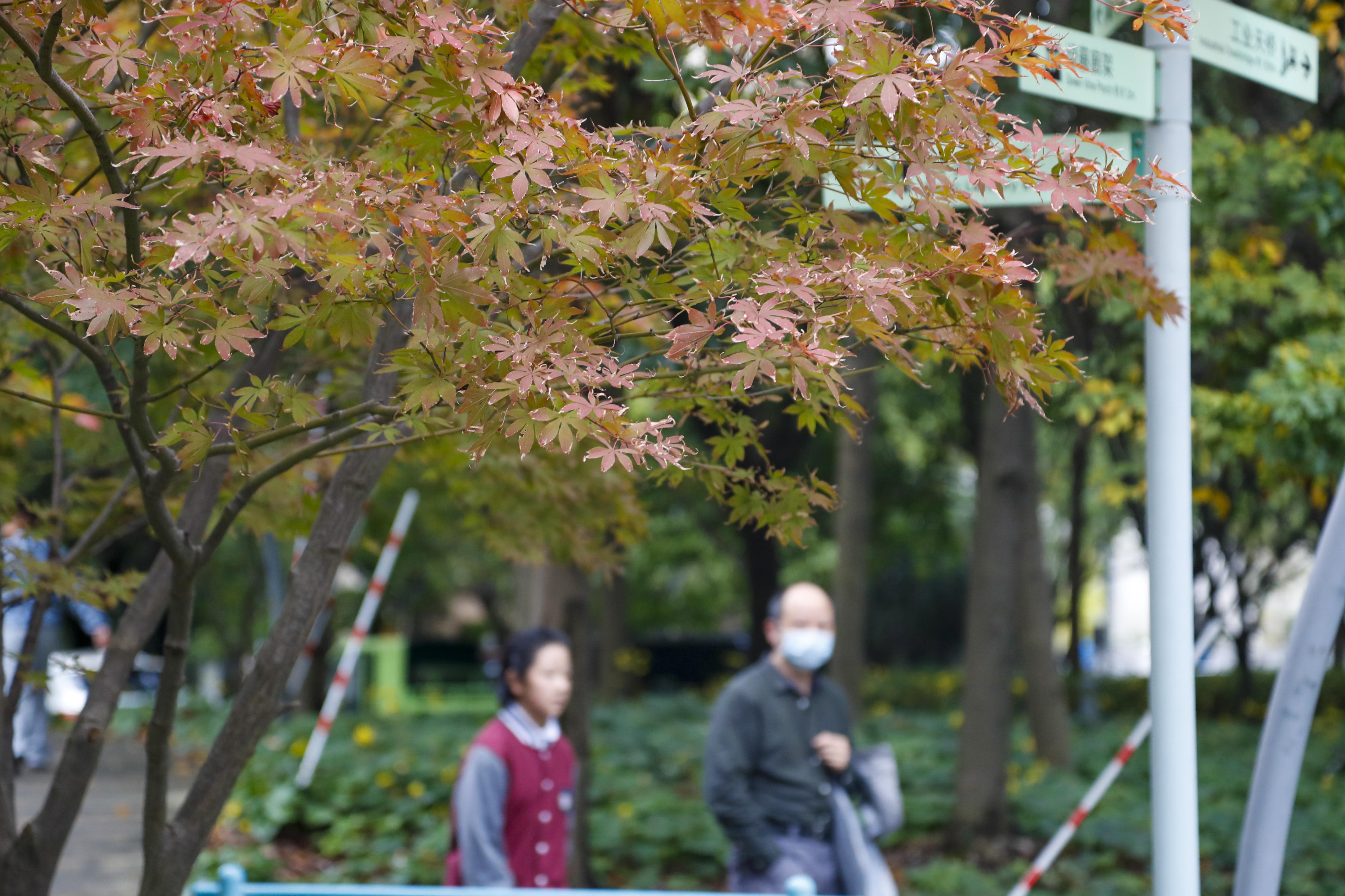 当然,妙的不只有银杏,还有枫叶。黄浦滨江旁的南园里,树上枝头的红枫叶也正在逐渐被染红。