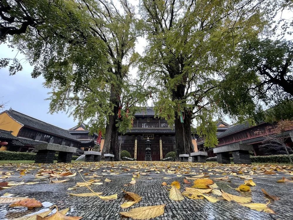 大蒸港河水蜿蜒流淌,河畔千年古刹庄严寺内两株百年银杏古树,相依相伴,树冠相连,被人们称作“兄弟树”。每逢深秋,满树的黄叶与古老的寺院交相映衬,再配上一地落叶,这里的一砖一瓦都让人感受到清幽宁静。