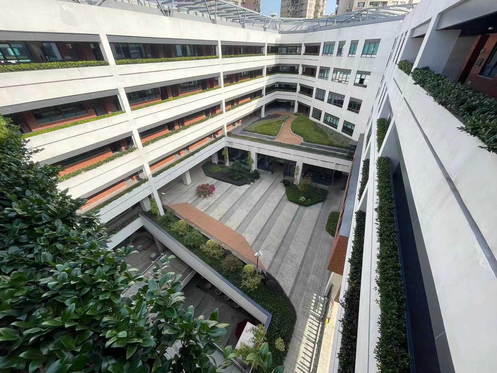 从高处往下看,整个校舍外观呈不规则的“回”字型,在设置教室和教师办公室时,严格遵循学生主体地位保障的理念,将学生教室安排在内部,教师办公室安排在外侧,因此呈现出一个非常“暖心”的布局——40个学生教室,全部朝南、全部南北通透、全部不沿马路、全部不沿操场,既能保障采光,又能保证安全,为学生提供了一个安静敞亮的学习环境。