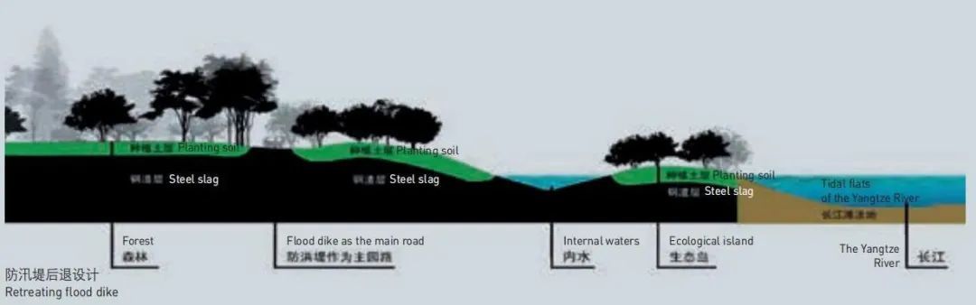 这里原来是长江的滩涂湿地,建国初期因战备需要,由废钢渣陆续回填形成43公顷陆域部分,钢渣平均深度8m,生态环境恶劣。为改善生态环境,弘扬炮台湾的历史与文化,发挥黄浦江与长江交汇处独一无二的地理优势和自然风貌,市、区两级政府共同规划建设公园。设计充分利用原有钢渣地的地形地貌,利用钢渣坑的深度设计矿坑花园,利用堆起的钢渣山设计假山等景观,利用陈钢渣作为道路、广场等硬质场地的路基,利用钢渣作为造型土,上覆种植土,满足种植条件,合理平衡土方,使钢渣不外运避免了二次污染,将岸线还给人民大众,实现人与长江零距离。