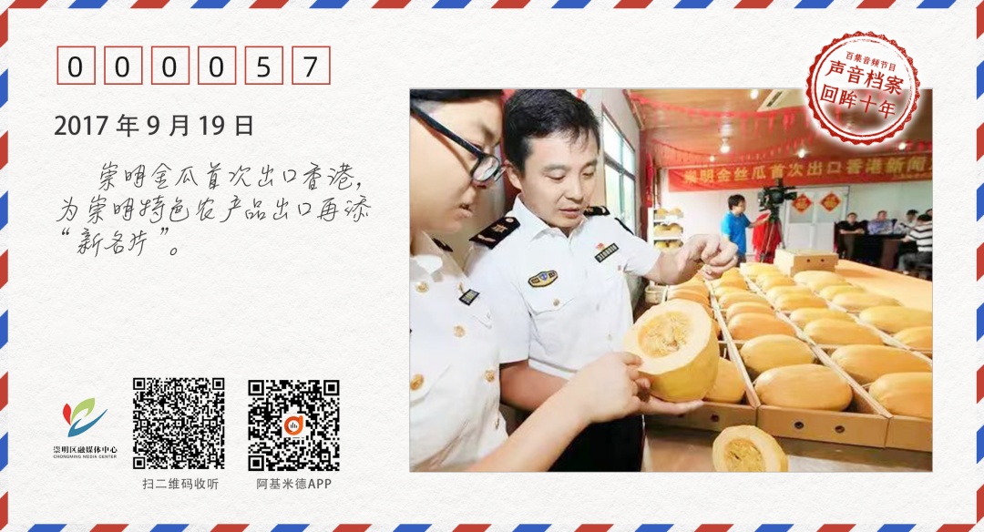 2017年9月19日,崇明金瓜首次出口香港。金瓜是崇明岛的传统特产之一,素有“植物海蜇”之美誉,但因其特殊的烹调制作方法,长期以来,崇明金瓜“养在深闺无人知”,一直未能走向更广阔的市场。由崇明堡镇新申乐活果蔬专业合作社种植的崇明金瓜在崇明国检局的帮助下首次发往香港,为崇明特色农产品出口再添“新名片”。2016年,新申乐活合作社出口的崇明水蜜桃、翠冠梨,在香港专卖店也广受好评。这几年中,该合作社还陆续将崇明甜芦粟、白扁豆等特色农产品送出国门,进一步提升了崇明特色农产品身价,并利用自身品牌优势和市场优势,扩大种植规模,带动周边农户共同致富,彰显企业社会责任。