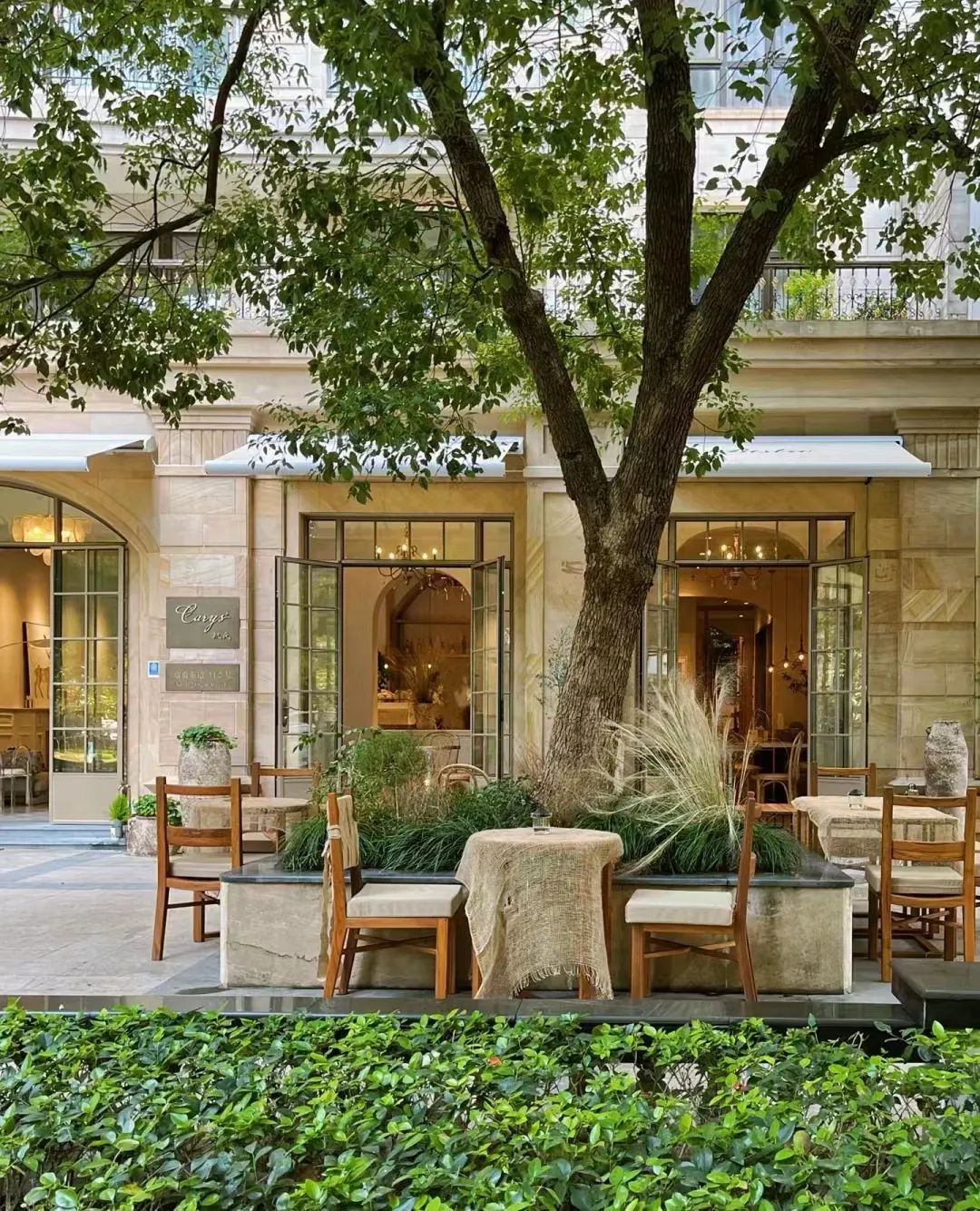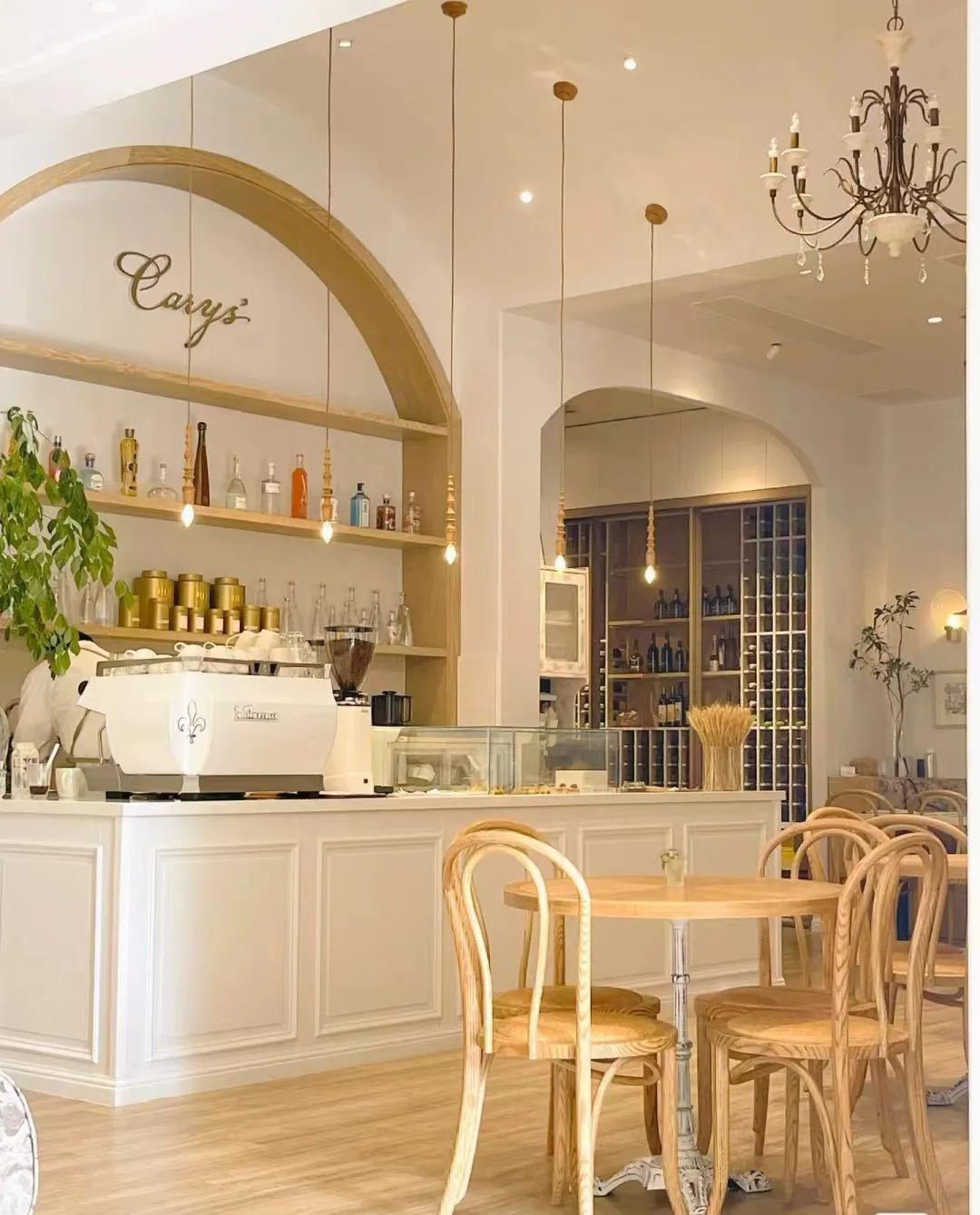 Carys’咖啡馆采用了敞开式的门面,营造出通透的空间感,随处可见的绿植,让空间的自然气息更加浓郁。靠近落地窗的连廊尽头,放置着一面刻画着浮雕的镜子,复古奢华中流露着法式浪漫,也是整个咖啡店里最出片的拍照点位。