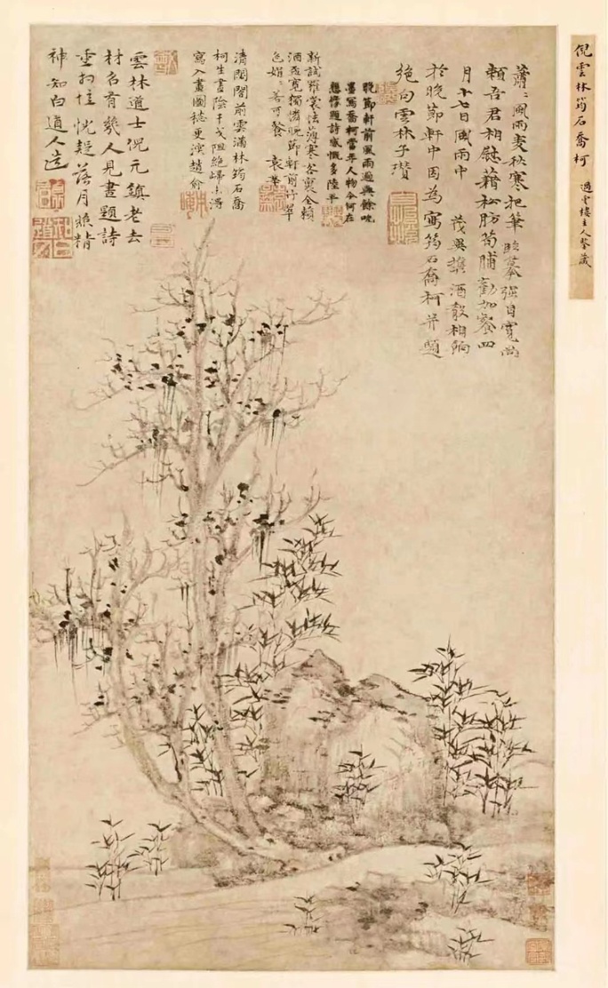 徐建融说,倪云林的另一件作品《竹石霜柯图》,画面上自题:“十一月一日灯下戏写竹石霜柯并题五言:久客令人厌,为生只自怜。每书空咄咄,聊偃腹便便。野竹寒烟外,霜柯夕照边。五湖风月逈,好在转渔船。云林子。”此画应该也是他在松江所作,只是不知具体的年份,上方有钱惟善、杨维桢的题诗,而钱惟善、杨维桢长期寓居松江。钱惟善题诗:“去年溪上泊轻舟,笑弄沧波狎海沤。云去楼空无此客,寒林留得数竿秋。”杨维桢题诗:“懒瓒先生懒下楼,先生避俗避如仇。自言写此三株树,清閟斋中笔已投。”这都说明倪云林孤傲不合世俗的行为只是当年在清閟阁中的孤芳自赏,而今沦落江湖就不能再一味地清高绝俗了。“今天,美术史的研究大多把倪云林看作是一名清高绝俗不食人间烟火的人物,包括他的人品和画品;然而,从他在松江时所作的这两幅作品,可见他完全已经放下了清閟阁时期的架子,已经入乡随俗地‘变雅入俗’了。这是倪云林人生、艺术的一个重大转折。”徐建融说。