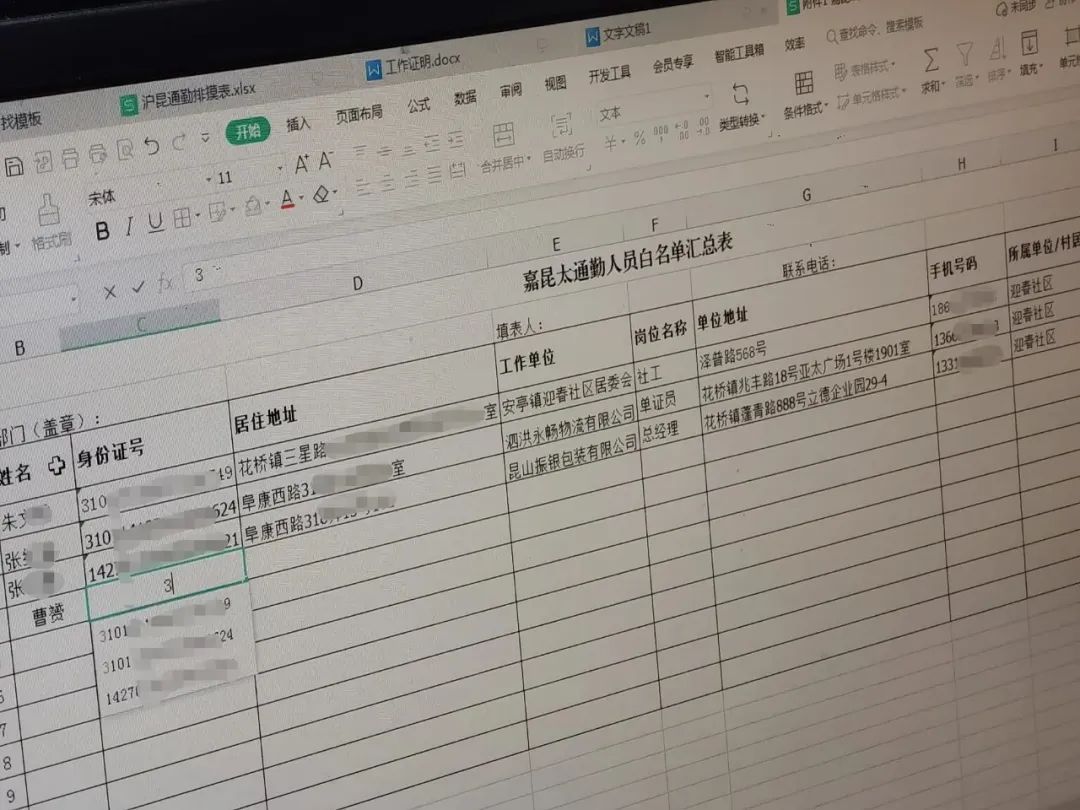 居委工作人员朱文雯表示,按照嘉定区申报跨省市通勤人员白名单的要求,居民除了要填写“嘉昆太通勤人员申请表”、个人防疫承诺书以及提交身份证复印件外,还需要企业出具加盖公章的用工证明材料。为此,居委会制作了申请表和企业证明文件的样张,供居民参考,以提高填写效率。