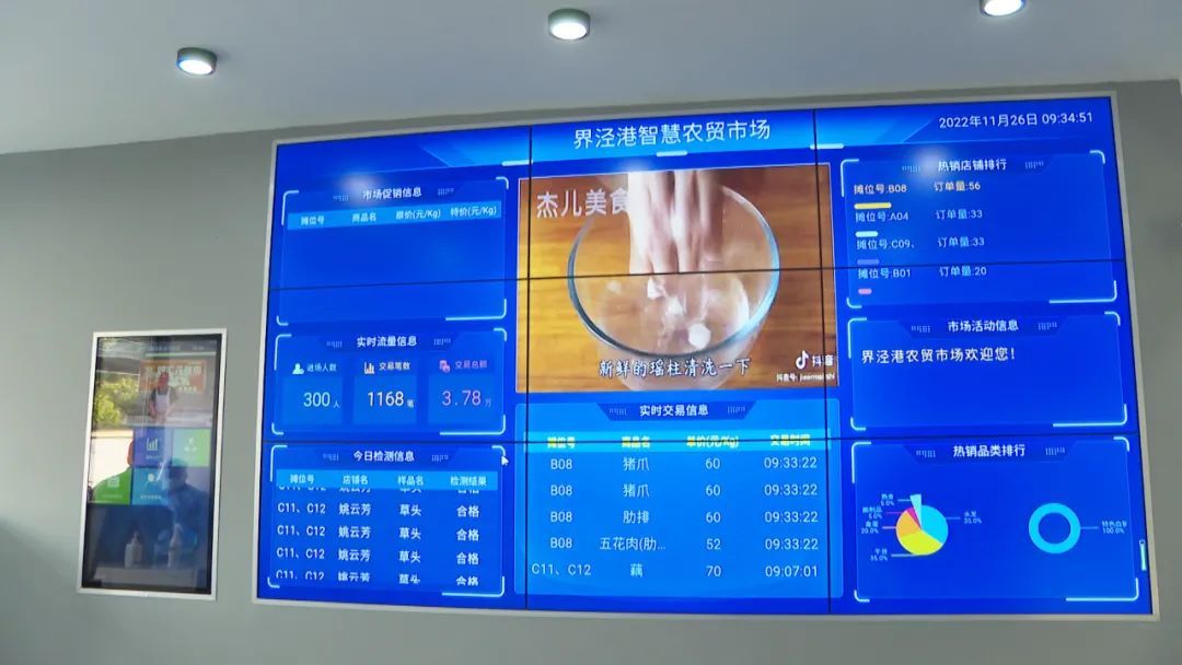 在界泾港菜场门口,菜场不仅安排工作人员帮助市民查码验码,还依托数字哨兵,打造“无疫”菜市场,市民仅在数字哨兵上出示场所码,便可以马上显示体温、核酸及行程状况。走进菜场,两块彩色液晶大屏格外引人注意,大屏上醒目地展示着交易、促销、进场人数、产品检测、今日菜价等信息。市场负责人表示,信息透明化、公开化,是确保诚信经营、公平交易的关键。