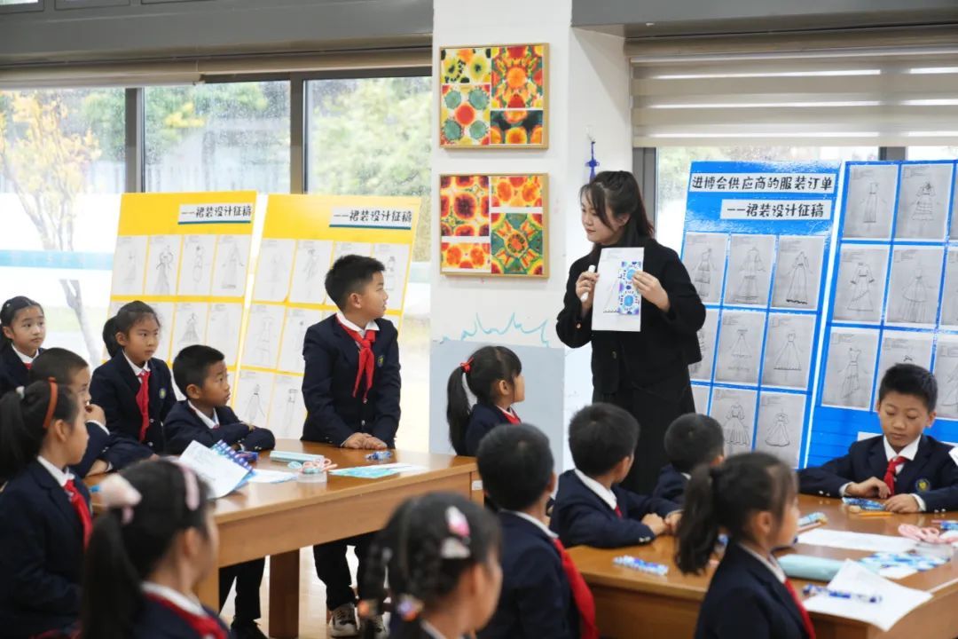 “来自进博会的服装订单”一课是三年级上册“都市印象”单元的拓展内容。课程创设了要完成进博会供应商服装订单的情境,形成驱动性问题:如何用扎染布料完成服装订单的设计。