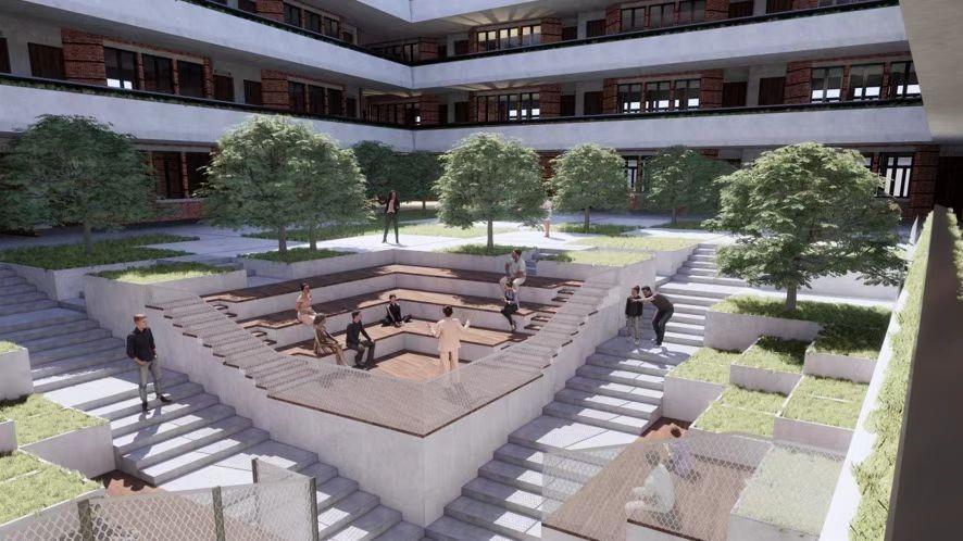 在比乐中学所在的黄浦区105号板块同样存在这样的问题。设计团队将运用平移的方式将三栋历史风貌建筑移至基地西南角,待校区改建完成后,风貌建筑将作为图书馆、游泳馆和家长开放空间使用,这不仅延续了历史风貌建筑的特色,也充分利用了该处空间。
