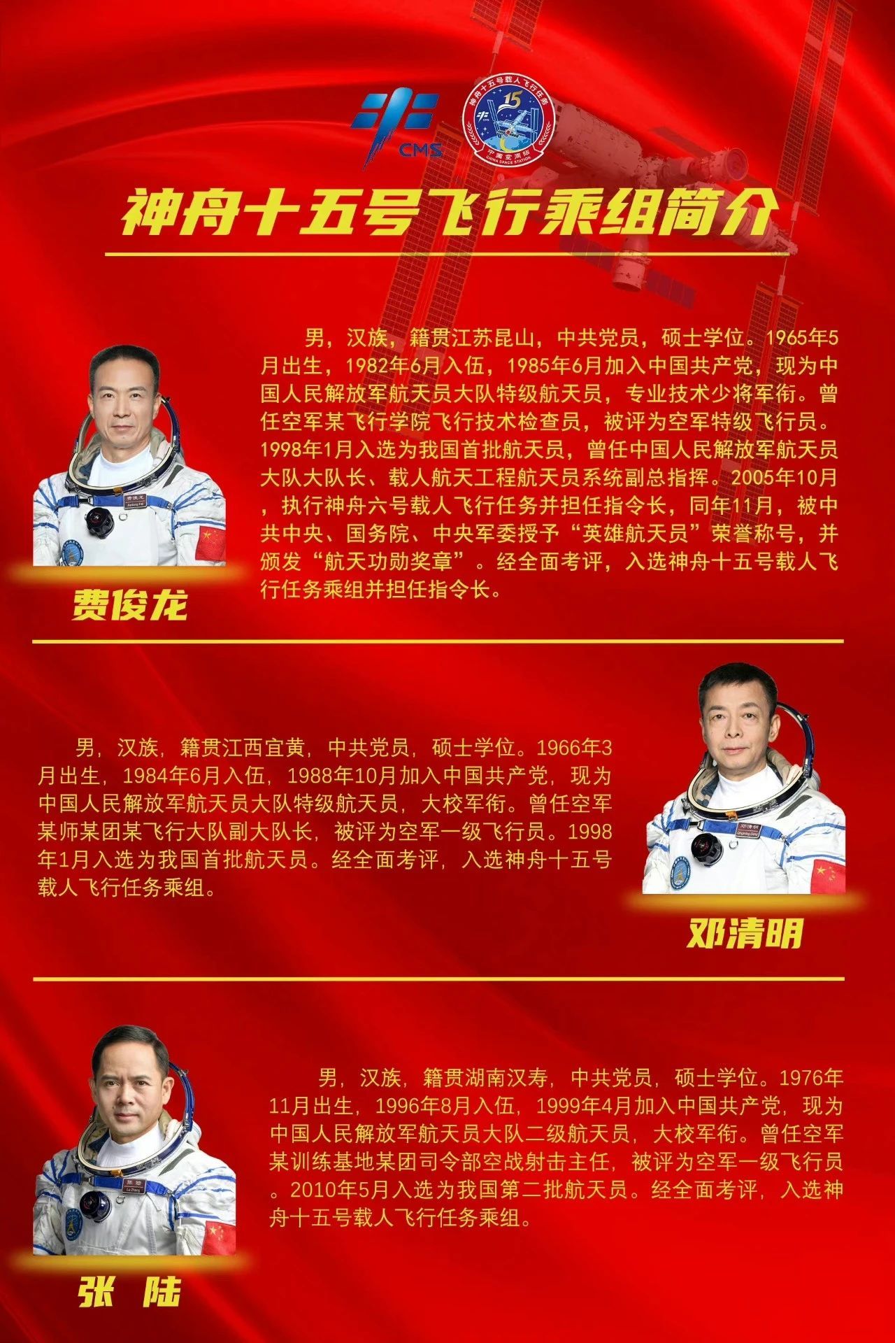据中国载人航天工程办公室消息,神舟十五号瞄准11月29日23时08分发射。经空间站阶段飞行任务总指挥部研究决定,费俊龙、邓清明、张陆3名航天员将执行神舟十五号载人飞行任务,由费俊龙担任指令长。