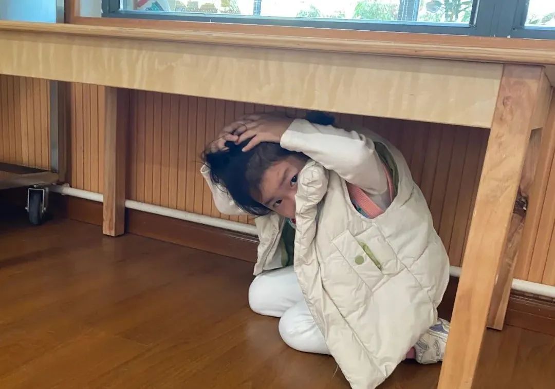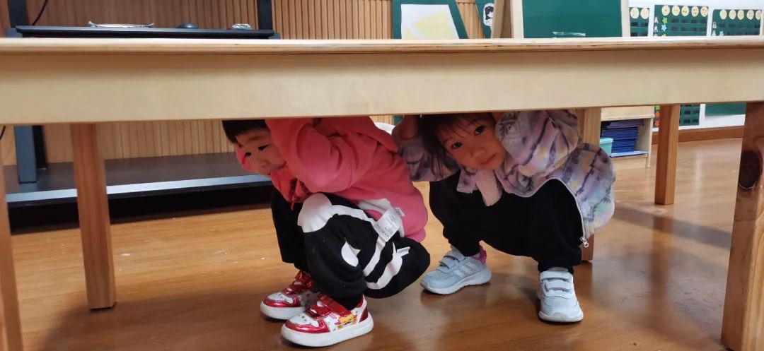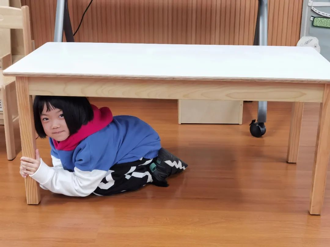 随着第一声警报声响起,班级老师立即告知幼儿“地震来了,不要慌”,并组织幼儿迅速的躲在安全的地方紧急避震,幼儿立即听从老师的指挥做出反应:低头弯腰、双手护头蹲在桌下或教室承重墙角落等进行避险自救。