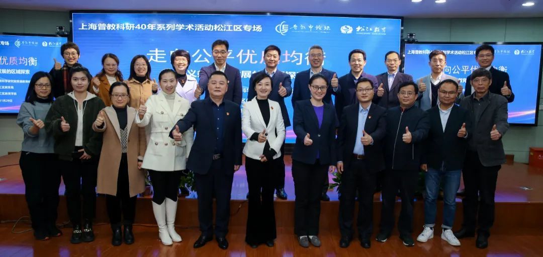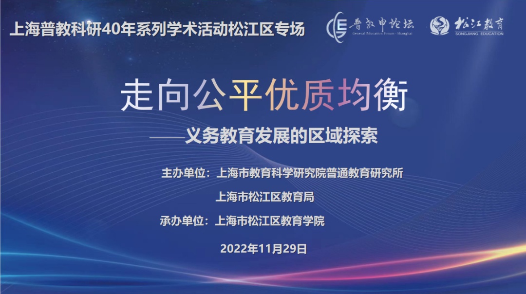 2022年11月29日下午,上海普教科研四十年系列学术活动松江专场——“走向公平优质均衡:义务教育发展的区域探索”研讨会在松江区教育学院举行。上海市教育科学研究院普通教育研究所所长徐士强、华东师范大学教育高等研究院副院长吴刚、上海市新优质学校研究所所长汤林春、上海市教育科学研究院普通教育研究所教育政策与舆情研究中心主任李金钊,松江区教育学院党委书记陈赣、院长钱秋萍,松江区教育局副局长朱永受邀出席。松江区在研市级课题负责人现场参会。上海市各区科研室主任、上海及云南的普教科研同仁在线参会。