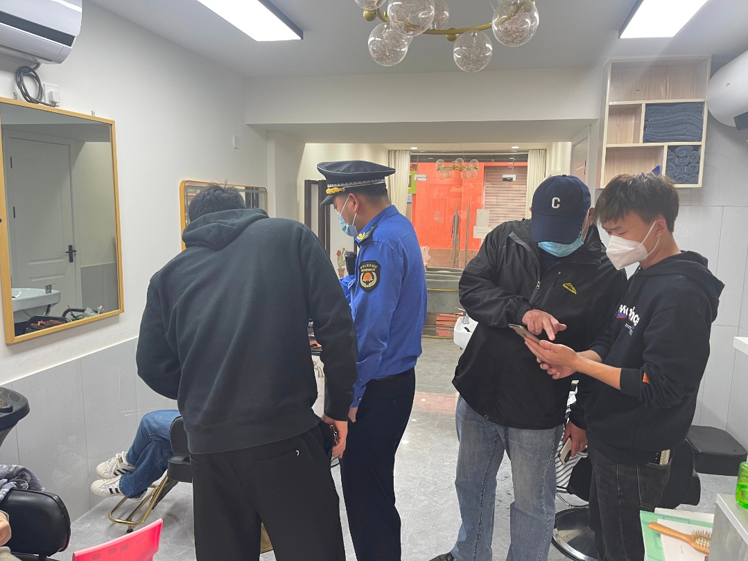 综合行政执法队对街面美容美发、足浴沐浴商户进行防疫措施督察:店员是否都是24小时核酸阴性;有无5日内从外地来沪者;入店扫“场所码”是否执行;“场所码”和消费单数是否对等。