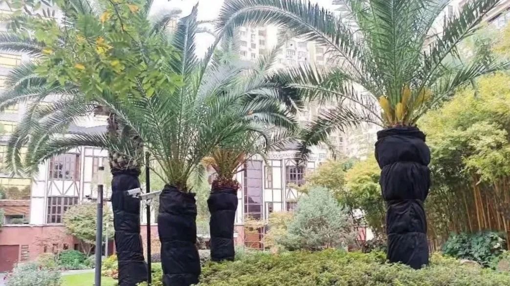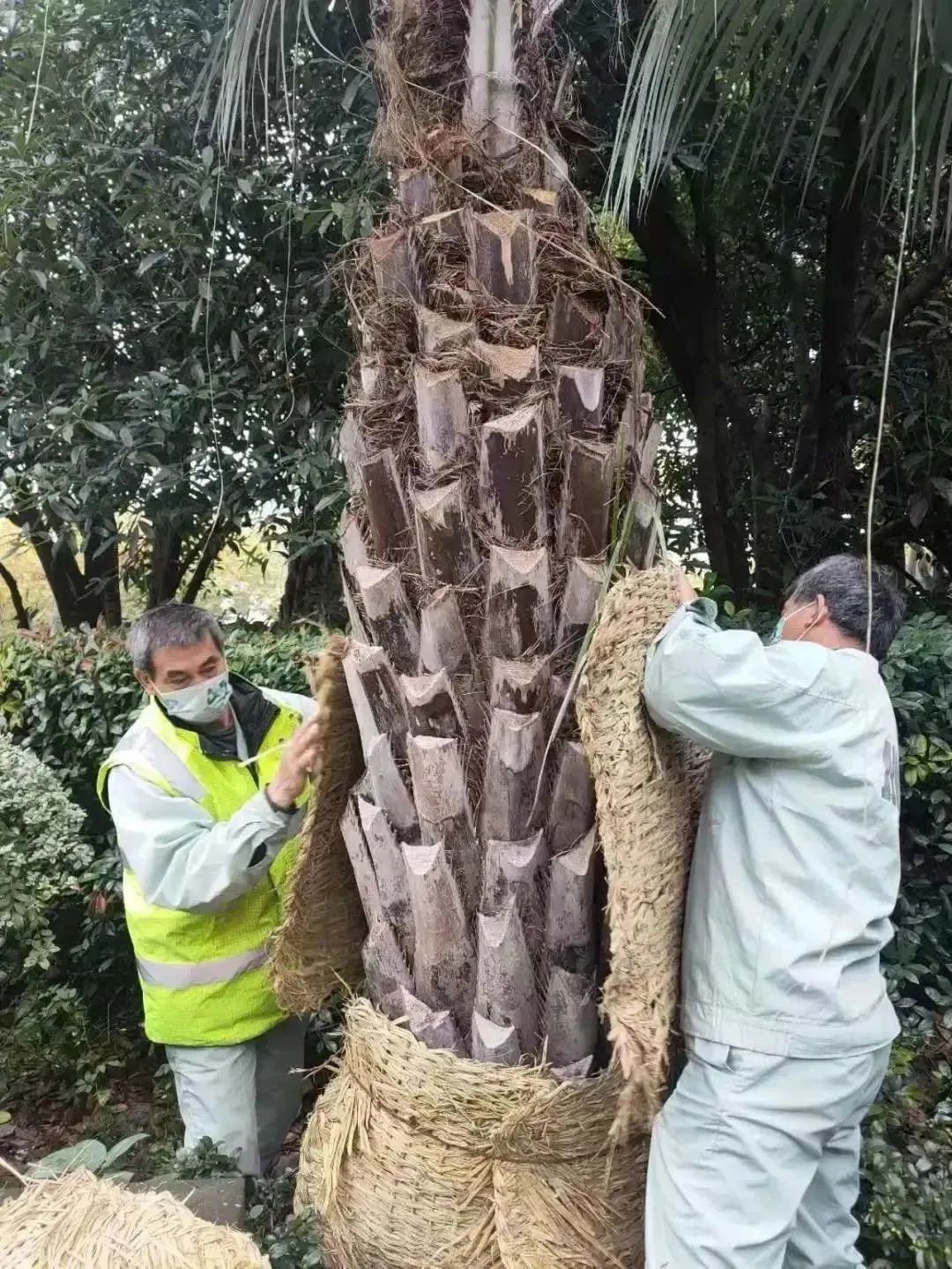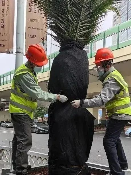 区绿化部门共计完成加拿利海枣、华棕、苏铁等354株乔木的防寒包扎工作,加固乔木158株,并对养护范围内景墙电磁阀、水管分别采取防寒保暖工作,切实做好静安区公共绿地、公园内树木的防寒防冻应对措施。