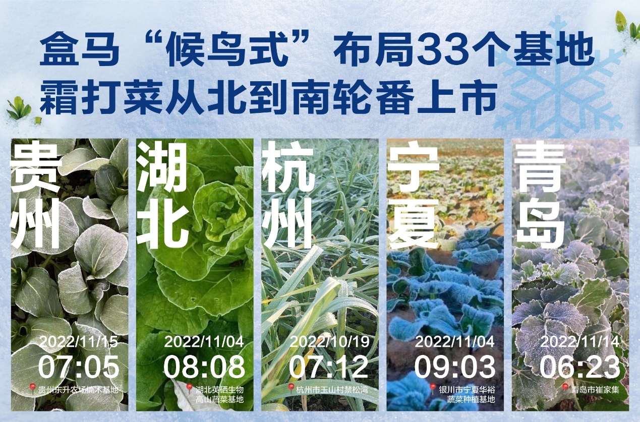 据盒马蔬菜采购程永洪介绍,由于今年是“前冬偏暖”,全国气温普遍偏高,很多蔬菜基地虽然早早做好了采收霜打菜的准备,但无奈一直在“等霜”,直到最近宁夏、山东、湖北等地蔬菜基地才开始下霜。