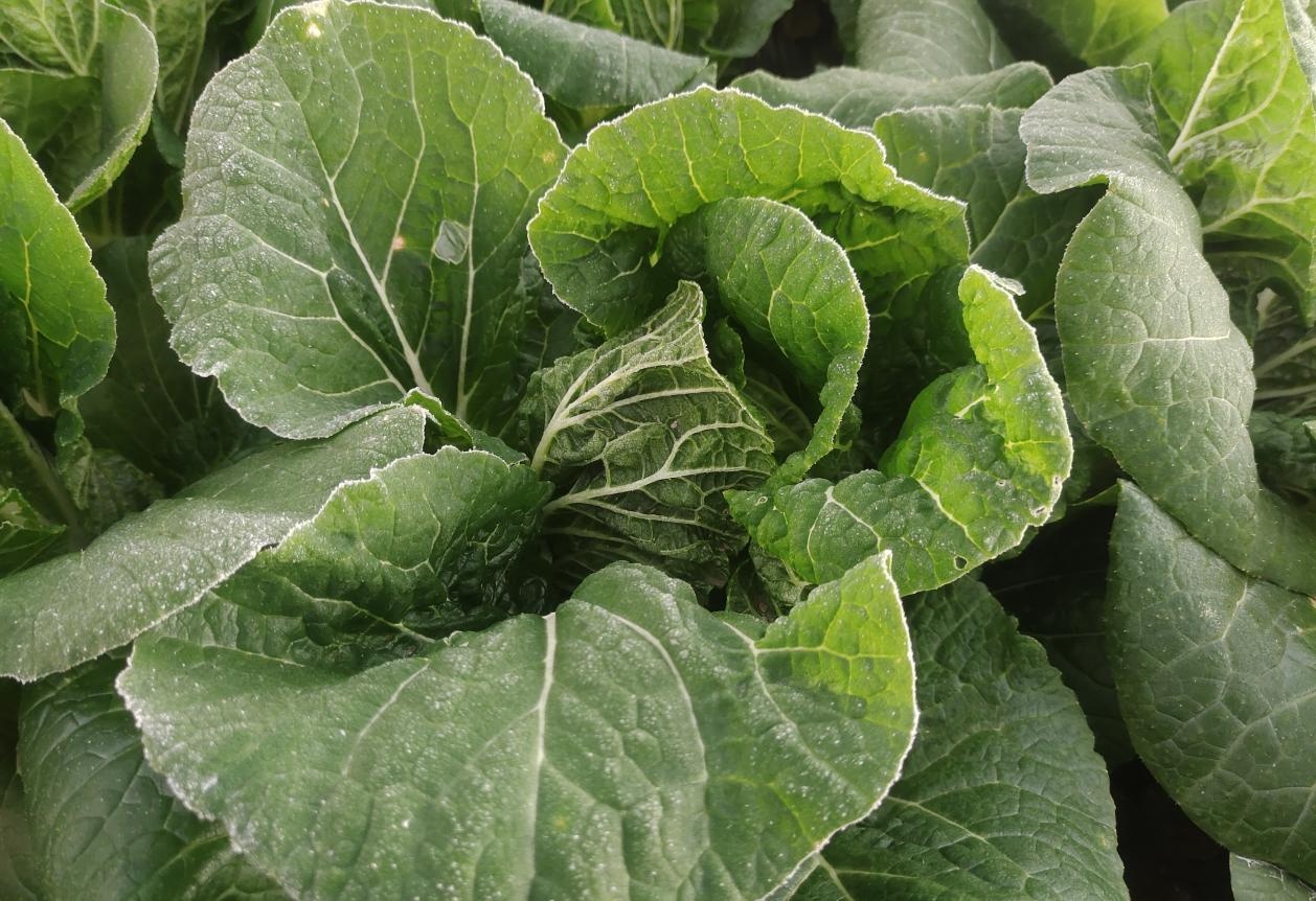 所谓“霜打菜”,是指随着地表温度接近零度,露天种植的叶菜被霜雪覆盖。蔬菜经霜以后,糖度储存更多,口感更好。