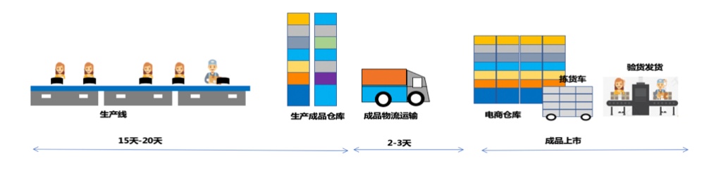 杭州简沐电子商务有限公司是专做恒源祥内衣品牌的电商企业,在日益加剧的电商竞争中,简沐发现依赖自己过去的传统模式已经跟不上互联网的节奏,其核心痛点是供应链端时效极差,从生产到成品销售需要将近一个月的周期,如下图。