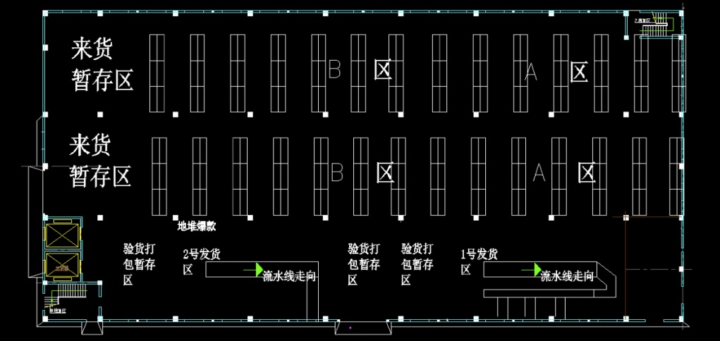 (3)算法团队会同实施工程师,针对性地建议货架、暂存区、打包区的布局。比如该仓库的两侧留有电梯,左进右出,左侧电梯旁留出来货暂存区,方便库存周转。来货暂存区旁为地堆爆款,方便来货补货。地堆爆款旁都配合有货架,货架与货架之间预留了1米8的间隙,方便拣货车交汇。另外在拣货的过程中,通过批次生成规则设计,始终让员工保持S路径拣货,并走到发货区。