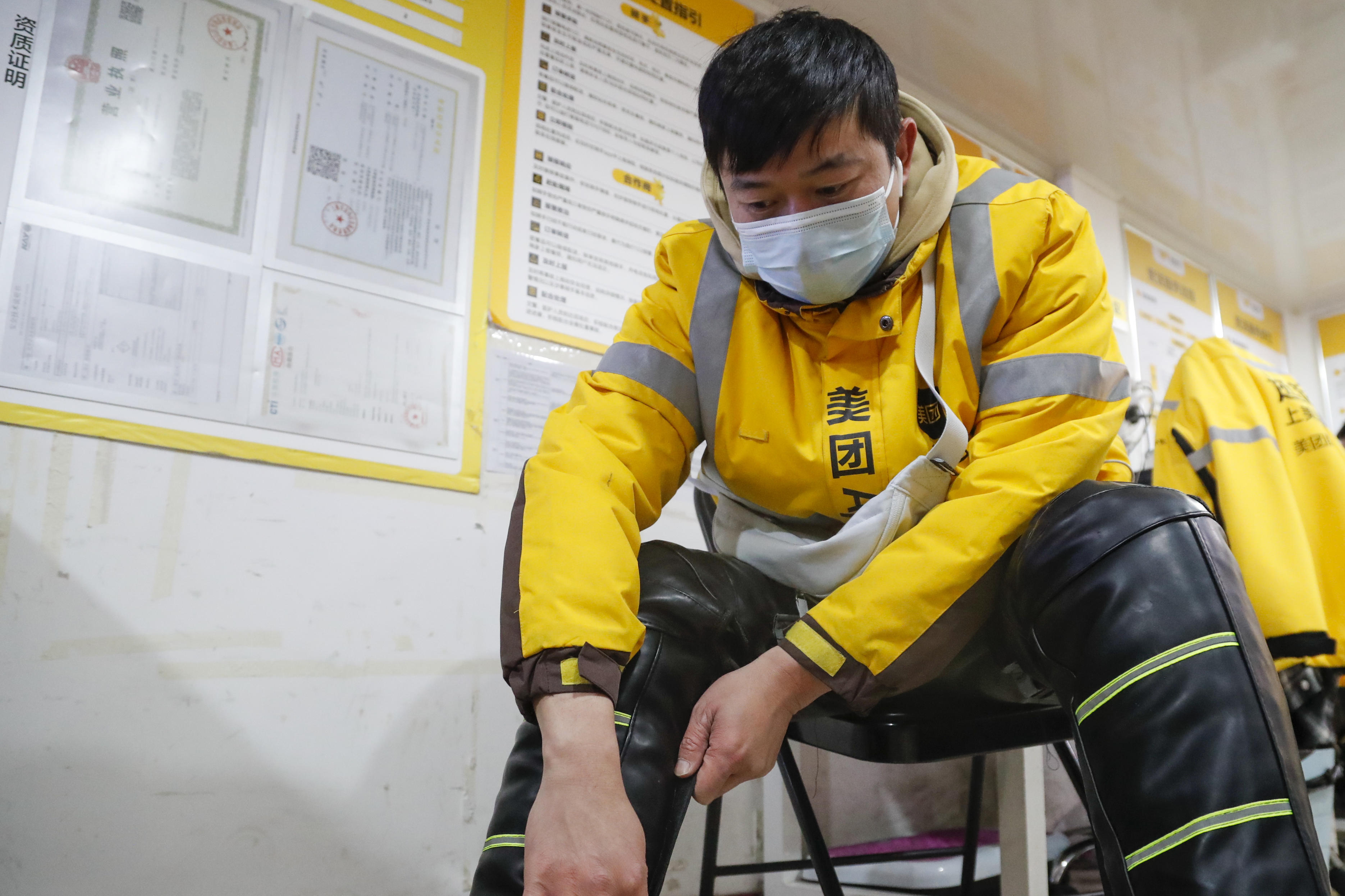 寒潮带来的大风、降雨和强降温,给整日奔波在外的骑手们带来不小的挑战。“这几天风雨太大了,车子也骑不快。”黄威穿戴好前不久领到的护膝和车把手套,套上头盔说道,“每年冬天,站点都统一给我们发防寒保暖物资,像我现在用的电动车保暖手把套、棉护膝、厚冬装、冬盔都是前不久刚发的,公司还为我们准备了早餐、下午茶和夜宵时段的充饥食品。”